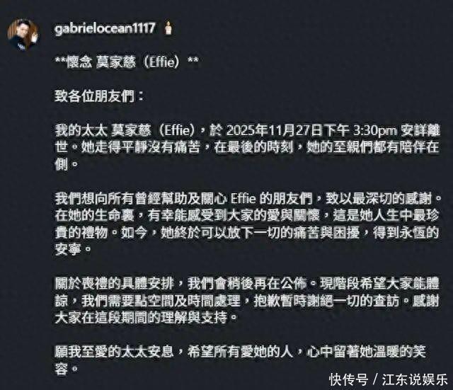 香港演员海俊杰妻子莫家慈今年39岁,在广州一间医院做完肝脏移植手术后出现并发症,于11月27日下午3点半去世。当天海俊杰在社交平台发消息说妻子走得很平静,亲戚都在场陪伴。